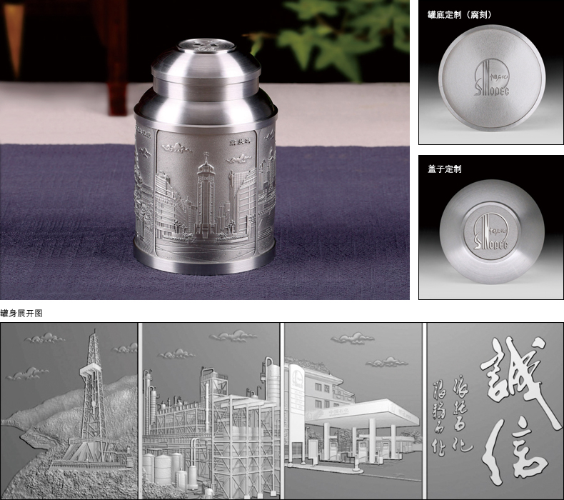 作為深度定制的經典款式,本款在罐身四個畫面做了定制,分別將企業的標志性地點、工程以及企業宗旨體現在罐身,罐蓋做LOGO定制。整體雕刻精細、畫面立體,專屬性強,極具紀念價值。