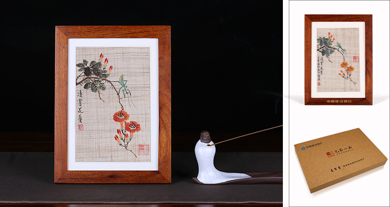 綠蔓如藤不用栽,淡青花繞竹籬開(kāi)。披衣向曉還堪愛(ài),忽見(jiàn)螳螂帶露來(lái)。 花與昆蟲(chóng),一靜一動(dòng),趣味頓生。本品選用150目原生態(tài)夏布,由巴蜀一品特約畫(huà)師唐云杰作畫(huà)秉承齊白石一派的簡(jiǎn)約寫(xiě)意,紅艷的花蔓在古樸的夏布上更添情致。高檔實(shí)木邊框,便攜小巧,在邊框下方及包裝盒上定制企業(yè)信息,簡(jiǎn)約美觀,專(zhuān)屬性強(qiáng)。